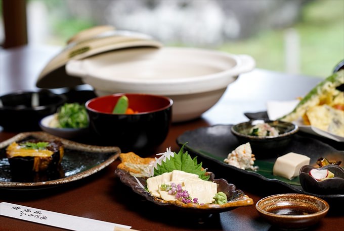 嵯峨豆腐を使った湯豆腐を味わえます。京野菜や湯葉を味わえる御膳、辛子豆腐や三輪そうめんを選べる定食も絶品。温物・揚物・小鉢・酢の物をセットにした定食は4,000円~。