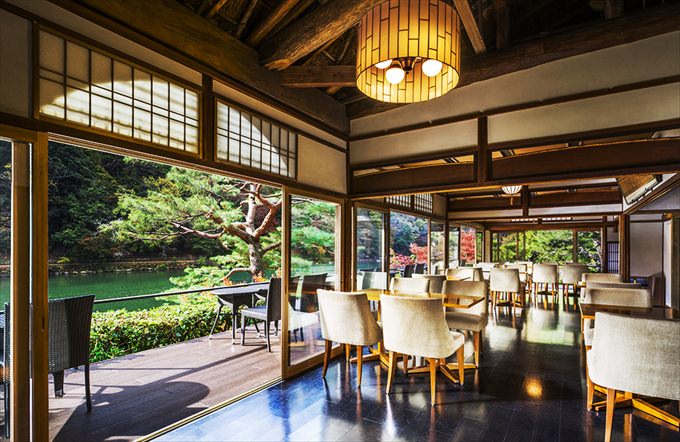 翠嵐ラグジュアリーコレクションホテル京都の1階に設けられています。テラス席からは嵐山の景色を眺望。保津川や渡月橋を眺めながら、食事を楽しめます。