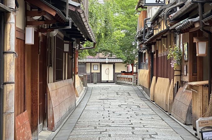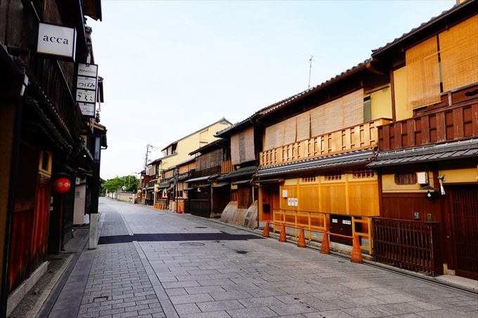 北は三条通から南は安井北門通まで1kmにわたるエリア。お茶屋や料亭が建ち並び、紅殻格子や犬矢来など、京都ならではの特徴を持った建物を眺められますよ。