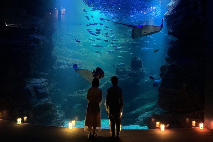館内には3つのカフェを併設。ミュージアムショップにはポーチやぬいぐるみ、お菓子などのお土産をそろえていますよ。2人で楽しむ水族館デート。生き物を観察しながら会話が弾み、相手との距離も縮まるかも。