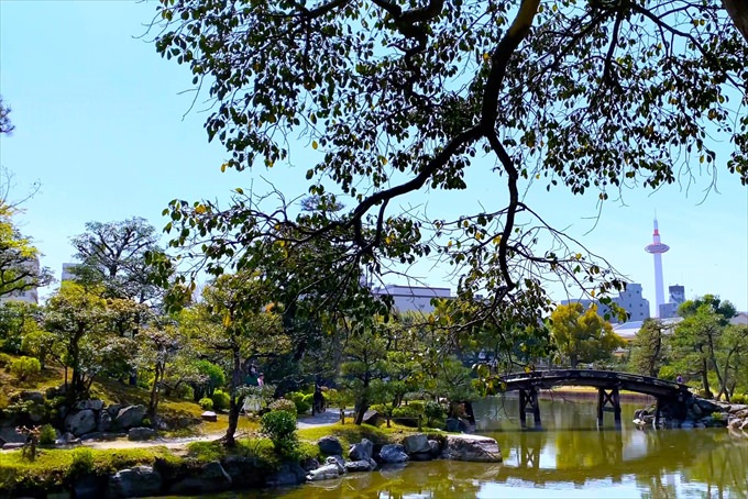 東本願寺にある庭園。1641年、三代将軍:徳川家光から約1万坪の土地が寄進されました。園内6分の1を占める「印月池」。池に浮かぶ「臥龍堂」。縁側が池に張り出した「滴翠軒」など、京都らしい「わびさび」を感じられますよ。