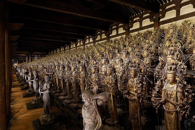 天台宗の寺院。千手観音坐像や風神・雷神像、二十八部衆像や千体千手観音立像の国宝を展示。南北約120mの本堂に、1,001体の像がそろっています。ずらりと並んだ像は圧巻!思わず手を合わせたくなる存在感です。