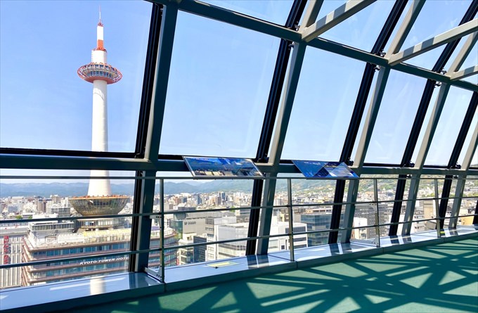 地上131mの建物です。地下1階は専門店や居酒屋。1階は土産店。2階では、和菓子づくりを体験できます。3階は京野菜を味わえるレストラン。5階~9階はホテルで、展望室3階がオシャレなカフェバーになっています。
