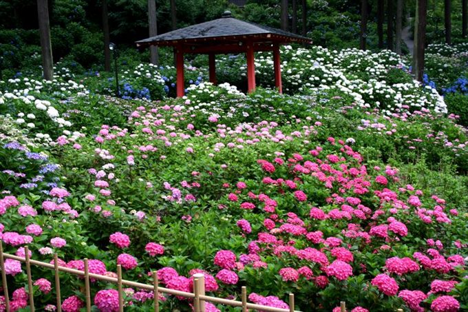 なんと言っても見どころは「あじさい園」。6月中旬から、50種2,000株のアジサイを眺められます。園内にはハート型に咲くアジサイもあり、それに出会うと恋愛運UP!
