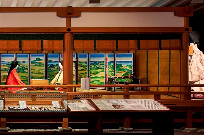 「源氏物語」の世界観を展示した博物館です。貴族の牛車や光源氏が暮らした「六条院」のジオラマ、「宇治十帖」を再現した物語シアターも放映。
