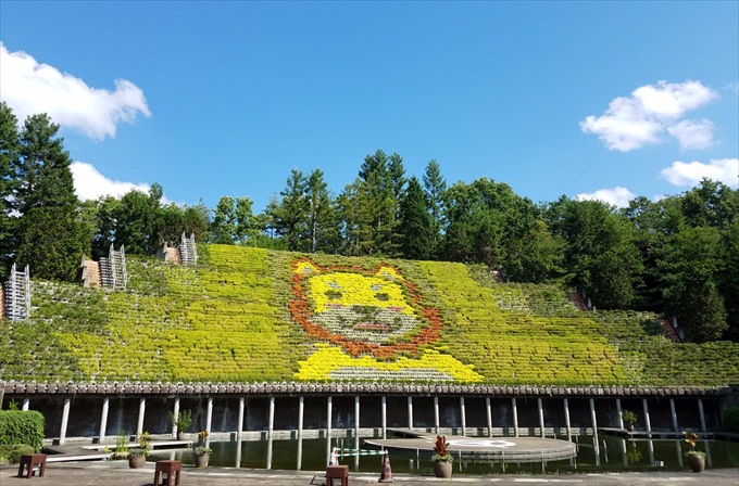 高さ18m幅62mの立体花壇が名物。46段のひな壇にプランターを並べ、さまざまなキャラクターを表現しています。