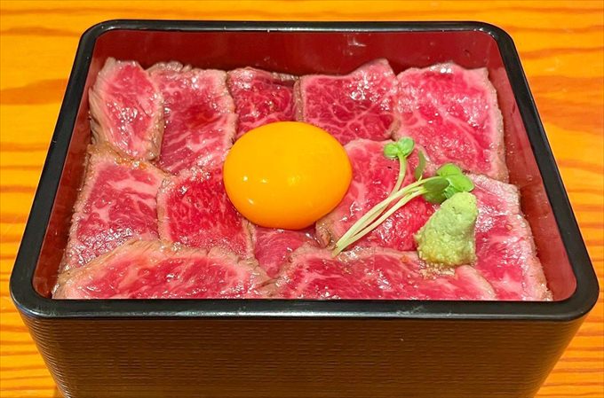 ステーキ重でお馴染みの専門店。焼肉重や炙り肉タク重、肉まぶしセットなどの肉づくし。卵黄やガーリックをトッピングすれば、さらにお好みの味へ。追加料金を払えば肉増しもできます。