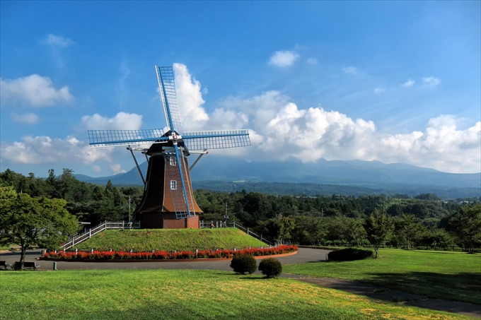 オランダ型の風車を目印とする「ぐりーんふらわー牧場・大胡」は、赤城山を背景にした道の駅です。