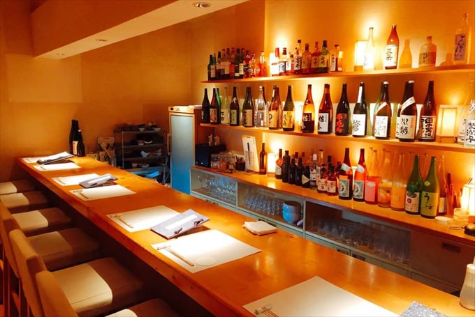お寿司屋さんのような清潔感ある店内はゆったりと過ごせるカウンター席がおすすめ。目の前に並ぶ日本酒をながめているだけでも気持ちが高揚します。