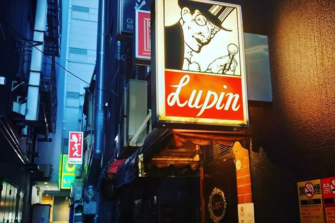 1928年創業、太宰治をはじめとする文豪や文化人に愛されたことで有名な老舗バー「ルパン 銀座」。目印の昭和レトロな看板が歴史の長さを感じさせます。