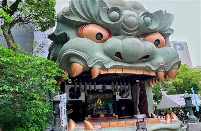 難波のパワースポットとして有名な神社。獅子が大きな口を開けた「獅子殿」と呼ばれる神殿が名物です。