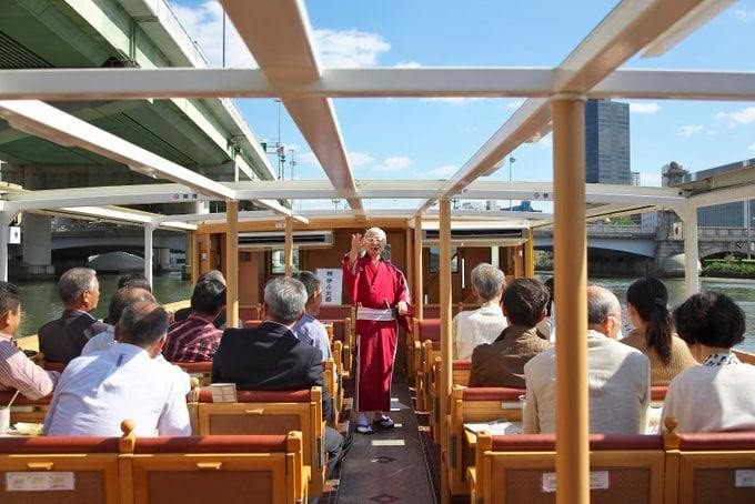 落語家さんの楽しい案内で回る珍しいクルーズ船。所要は90分と少し長めに設定されていますが、話の面白さにあっという間に感じてしまいます。