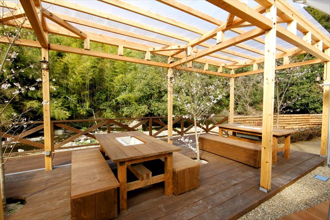 京都の風物詩である川床をイメージしたAエリア、ログハウス仕立ての建物Bエリア、芥川のすぐそばCエリアの3つのエリアがあります。それぞれ違った雰囲気で楽しめるので、お好きなエリアを選びましょう。