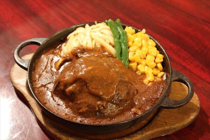 国産牛100%を使用した手ごねハンバーグはあつあつの鉄板で提供され、そのジューシーさはここでしか味わえない逸品。