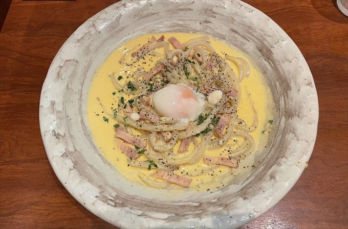 まるでパスタ?と疑ってしまうメニューがたくさんですが、なかでも特に人気なのが「カルボナーラうどん」。和ダシをきかせているので旨みとコクがたっぷりで、濃厚でありながらもどんどん箸が進む美味しさです。