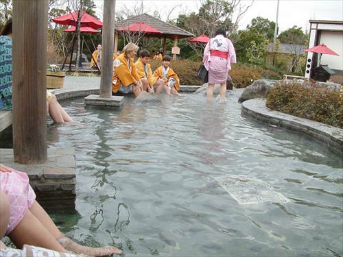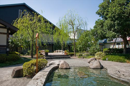 温泉は男女別だが、大江戸温泉物語にはカップルで一緒に利用できるサービスがいっぱい。700坪の日本庭園に伸びる全長50mの「足湯ゾーン」は特に人気。川底に足ツボを刺激する丸石が敷き詰められた湯の道を歩いて巡ったり、川べりに腰掛けながらのんびり二人の時間を過ごそう。