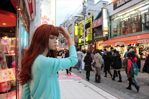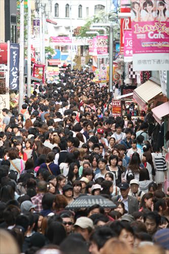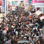 連日多くの若者でにぎわいを見せる竹下通り。特に休日は全国から集まった若者であふれかえり、歩くのが困難になるほど。外国人観光客や修学旅行生の姿も目立つ。