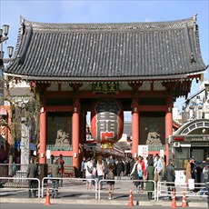 浅草寺参道の入り口にそびえる雷門。自然災害からの除難と五穀豊穣を祈願して、風神・雷神が祀られていることから、正しくは「風雷神門」という。大きな赤い提灯は、浅草のシンボルとして親しまれ、人気の撮影スポット。門の前は、記念撮影をする観光客でいつもにぎわっている。雷門の先には、江戸情緒あふれる商店街「仲見世」が続いている。