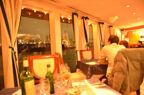 東京湾を巡る、本格レストランを完備したクルーズ船「シンフォニー」。ランチ、アフタヌーン、サンセット、ディナーと1日4便運航しており、料理もフレンチ、イタリアン、バイキングの3種類から選ぶことができる。