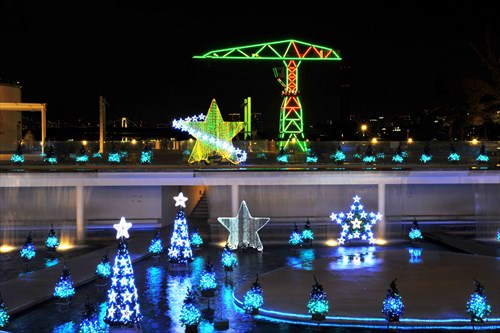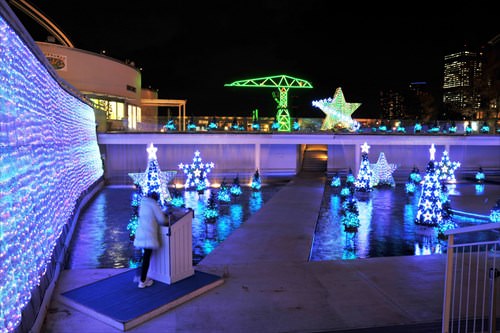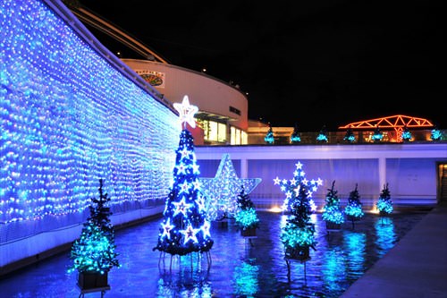 規模は大きくないが、沈みゆく夕日や、対岸にきらめく都心の夜景など、海辺の景色と合わせて楽しめるイルミネーションスポット。