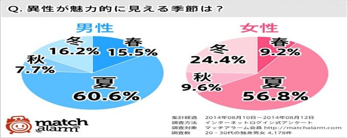 Facebookを活用した婚活アプリ「マッチアラーム」が実施した調査によると、「異性が魅力的に見える季節は?」との問いに対し、男性の60.6%、女性の56.8%が夏と回答しました。