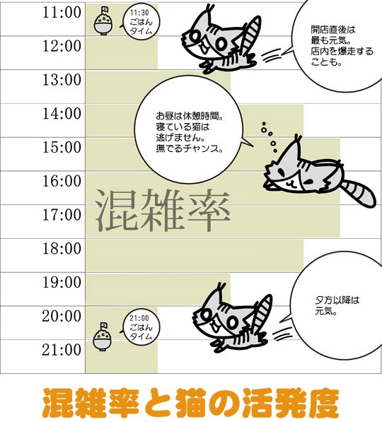 | 備考 | 外出可 ネットゲームあり 携帯電話充電器あり コンセントの電源使用自由 食べ物・飲み物の持ち込み自由(酒類不可。入店時スタッフに申請が必要) 猫おもちゃ持込自由(未使用品限定。入店時スタッフに申請が必要) 猫への差入自由(無添加品限定。入店時スタッフに申請が必要) カメラ撮影自由(フラッシュ不可) 撮影写真の利用自由(ネット・印刷物等) |